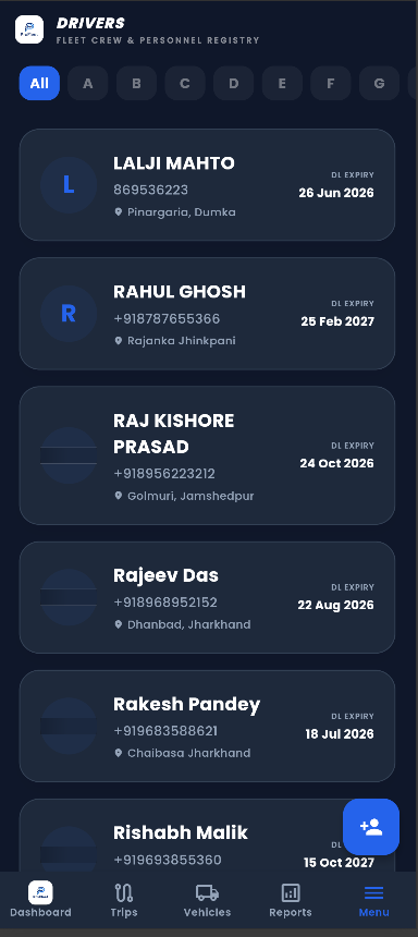 Onboard drivers with Aadhar/DL. Track trip counts and automatic DL renewal alerts. आधार और DL के साथ ड्राइवरों को जोड़ें। उनके चक्कर और DL रिन्यूअल का ध्यान रखें।