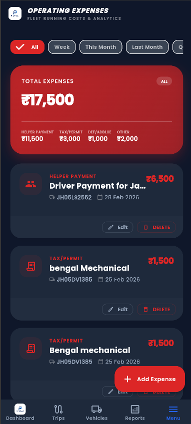 Track everything from paper-work costs and extra fuel to monthly EMI payments. Sync between Web and Mobile for real-time visibility. कागजी काम के खर्चे, फालतू डीजल से लेकर हर महीने की EMI तक—सबका हिसाब रखें। मोबाइल और वेब दोनों पर एक साथ।