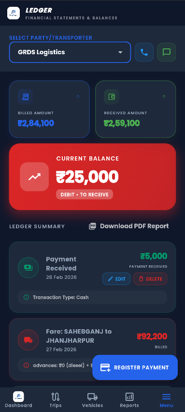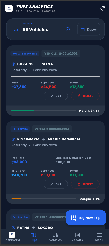 Accounting for every trip activity—from fuel advances to driver expenses—provides a 360-degree view of your business health. You instantly know which routes and trip types are truly profitable. ईंधन एडवांस से लेकर ड्राइवर के खर्चों तक, हर ट्रिप गतिविधि का हिसाब रखने से बिजनेस की पूरी जानकारी मिलती है। आप तुरंत जान सकते हैं कि कौन से रूट और ट्रिप असली मुनाफा दे रहे हैं।