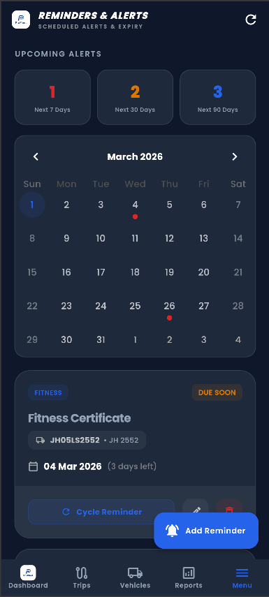 Never miss a deadline. Automated cycles for Pollution, Fitness, Permits (1yr/5yr), Tax, and regular checkups. Setup once, stay compliant forever. प्रदूषण, फिट्नेस, परमिट (1 साल / 5 साल), टैक्स और सर्विस के लिए ऑटोमैटिक अलर्ट। एक बार सेट करें और बेफिक्र हो जाएं।
